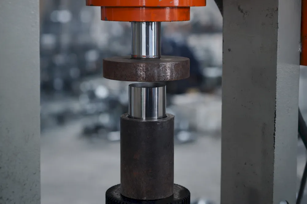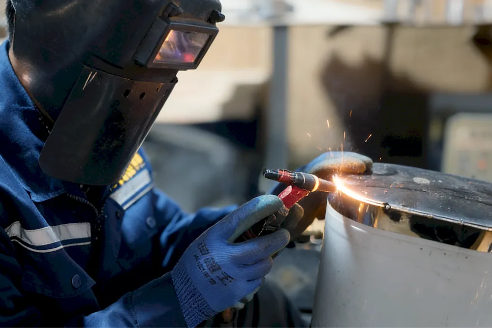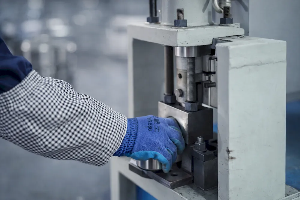 Manual assembly and welding of valve muƿers with cold welding machines, featuring uniform and aesthetic welds.