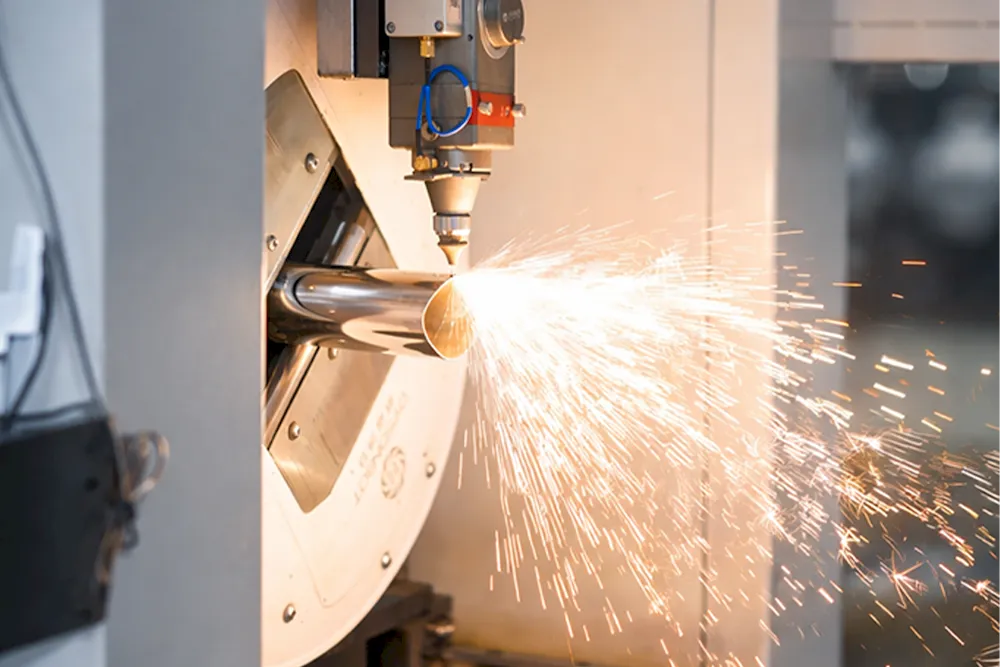 1500-watt laser tube cutting machine for cutting and blanking various diameters of pipes required for valve mufflers, including perforating backpressure pipes. The cutting process ensures burr-free edges, standardized dimensions, consistent products, and reduced labor requirements.